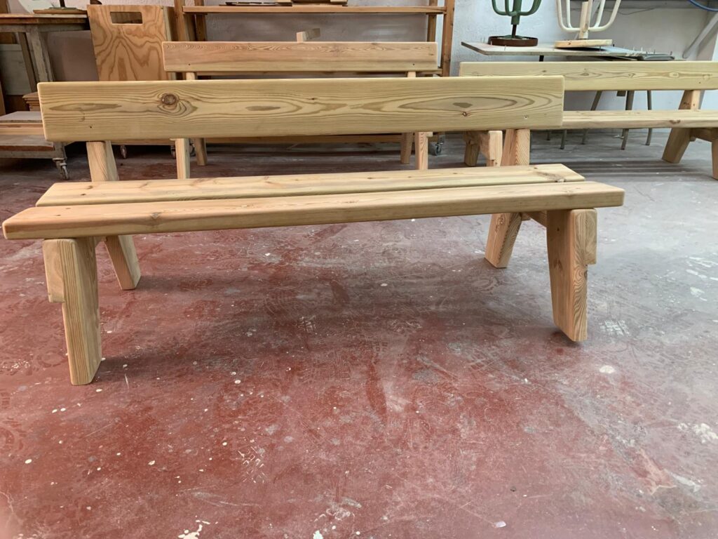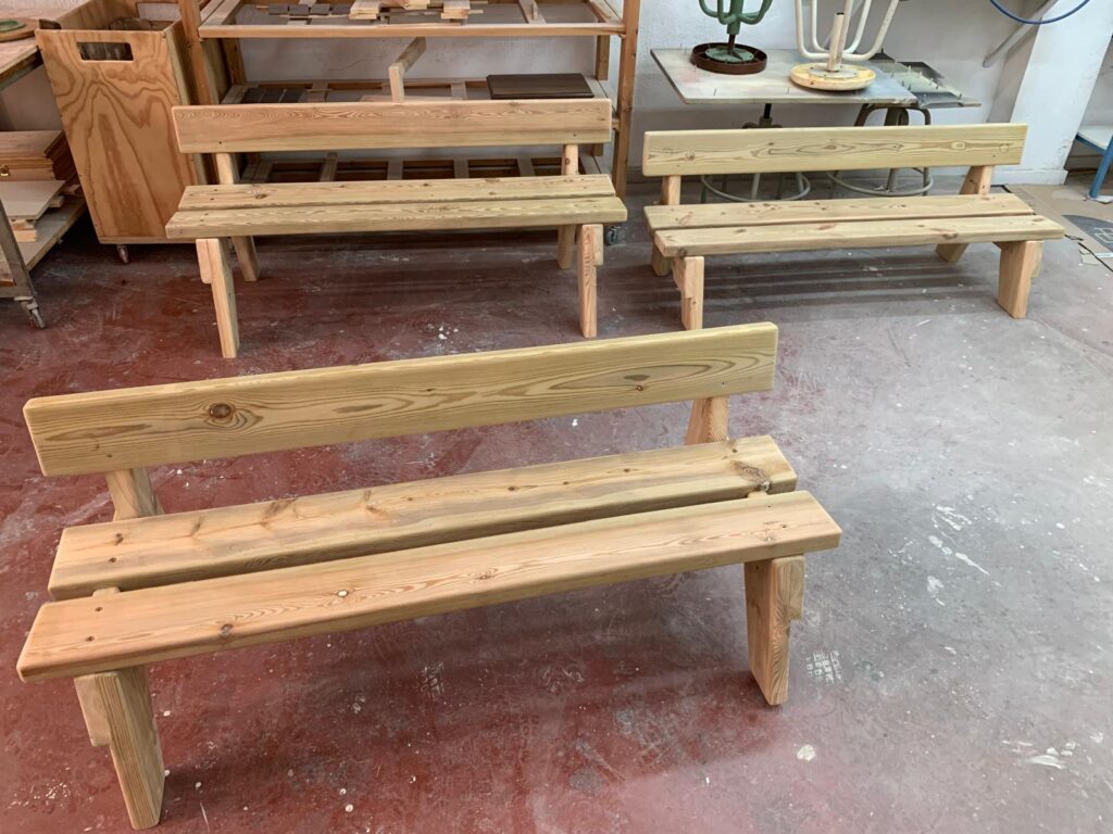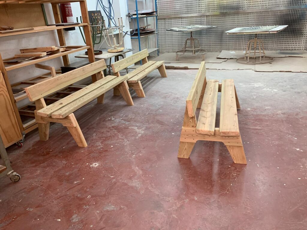 Los bancos han sido diseñados y fabricados por el propio alumnado en el taller del ciclo formativo, dentro de las actividades prácticas del módulo profesional. Durante el proceso, el estudiantado ha trabajado todas las fases del proyecto: diseño de las piezas, selección de materiales, mecanizado, montaje y acabado final.