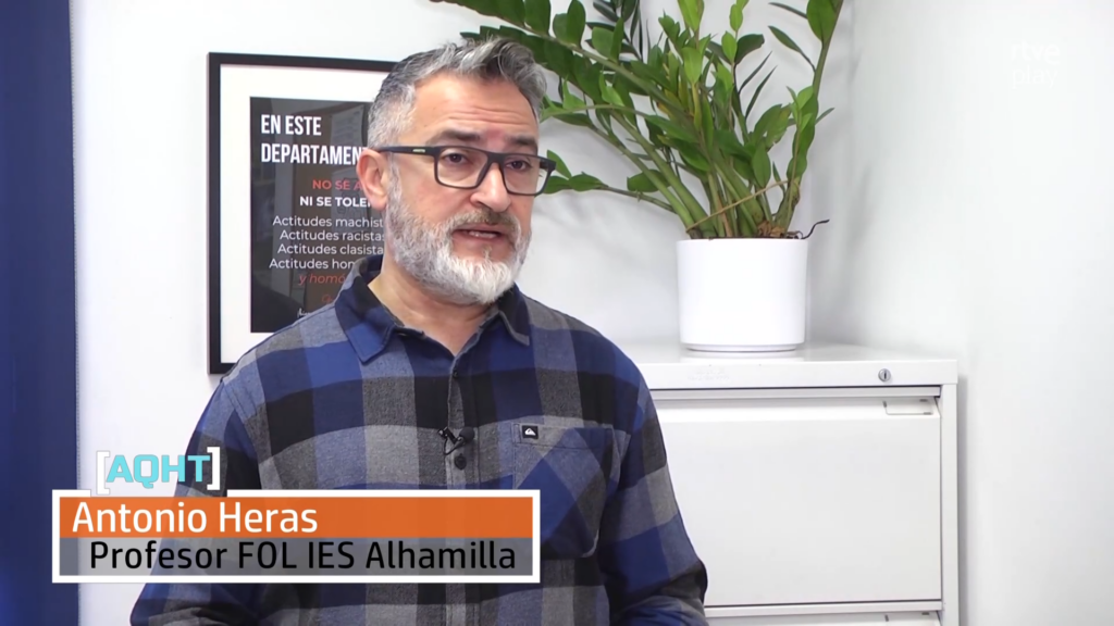 El reportaje visita nuestro IES Alhamilla en Almería para mostrar cómo se imparte esta materia en las aulas de Formación Profesional y Educación Secundaria. Destaca especialmente la participación de nuestro compañero Antonio J. Heras, profesor de FOL y presidente de ANPROFOL (Asociación Nacional de Profesorado de FOL), quien explica la importancia de esta especialidad y cómo desde ANPROFOL utilizan el propio programa ‘Aquí hay trabajo’ como recurso educativo en las clases.